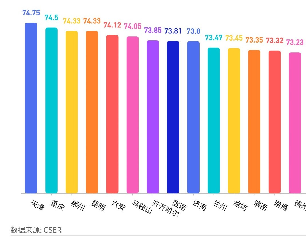 天津74.75,重慶74.5,濟(jì)南73.8,西安73.15,青島73.03,成都72.56,上海72.5,深圳72.19,沈陽(yáng)71.87,杭州70.71,北京70.5,長(zhǎng)春70.43,廣州69.36,寧波69.07,武漢69.02,哈爾濱68.48,大連67.34,南京66.81,廈門64.32。