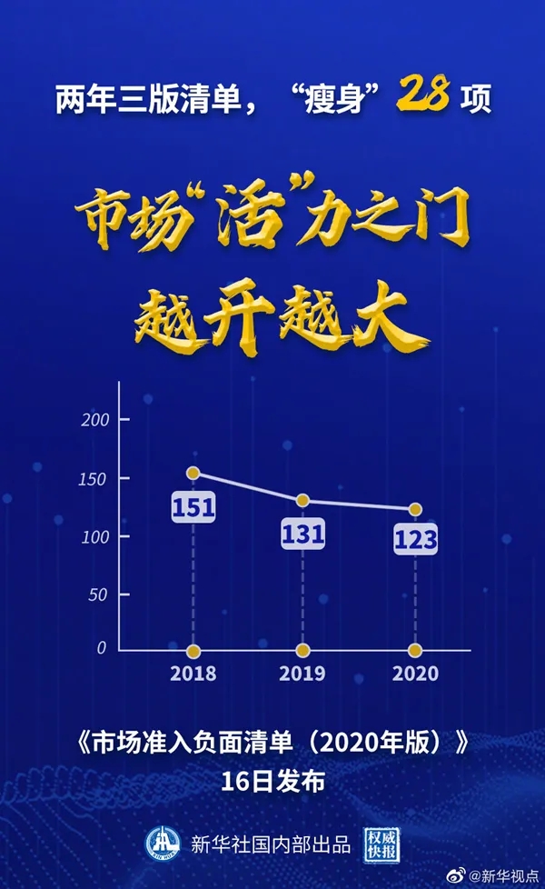 國家發(fā)展改革委、商務(wù)部16日公布《市場準(zhǔn)入負面清單(2020年版)》。新版清單直接放開“森林資源資產(chǎn)評估項目核準(zhǔn)”等措施,刪除“證券公司董事、監(jiān)事、高級管理人員任職資格核準(zhǔn)”等措施,清單事項縮減至123項,比2019年版清單再減8項。(記者安蓓 海報設(shè)計:張惠慧 張晨光)