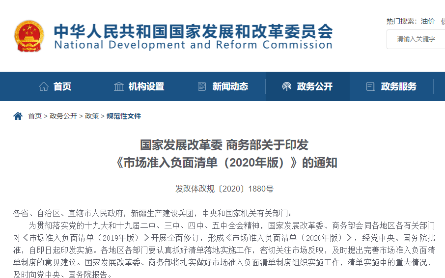 國家發(fā)展改革委新聞發(fā)言人孟瑋表示,從2018年12月正式發(fā)布全國統(tǒng)一的市場準(zhǔn)入負面清單以來,通過三年落地實施,已經(jīng)實現(xiàn)了在全國范圍確立了市場準(zhǔn)入環(huán)節(jié)的負面清單管理模式。清單之外的行業(yè)、領(lǐng)域、業(yè)務(wù)等,市場主體可以依法平等進入,實現(xiàn)“非禁即入”。