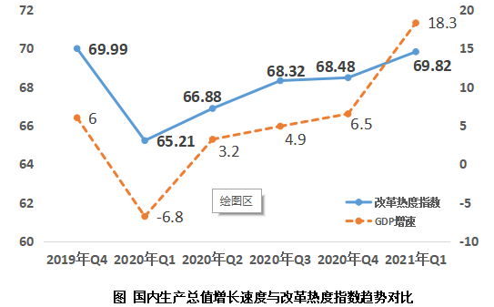 4月21日,中國經(jīng)濟體制改革研究會在京發(fā)布《2021年第一季度改革熱度第三方評估報告》。報告顯示,2021年第一季度改革熱度指數(shù)為69.82,比上一季度增加1.34,連續(xù)4個季度保持穩(wěn)定回升態(tài)勢;比去年同期增加4.61,已經(jīng)基本接近疫情前2019年第4季度69.99的水平。