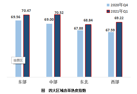 2、中西部地區(qū)引領指數(shù)回升趨勢。從四大區(qū)域來看,東部、中部、東北、西部的改革熱度指數(shù)分別為70.47,70.52,68.84,69.22;中、西部地區(qū)指數(shù)增幅超越東部。從排名來看,中部地區(qū)超越東部地區(qū),名列第一;西部地區(qū)小幅超越東北地區(qū)位居第三,東北地區(qū)墊底。