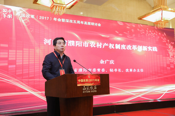 河南省濮陽市委常委、秘書長、改革辦主任余廣慶介紹了濮陽特色鮮明的農(nóng)村集體產(chǎn)權(quán)制度改革經(jīng)驗:在推進農(nóng)村集體產(chǎn)權(quán)制度改革中,濮陽市農(nóng)村黨支部成為基層黨建工作的一個重大創(chuàng)新,市委領(lǐng)導親自上陣親自督辦、跟蹤進度;建成了比較完善的市縣鄉(xiāng)三級產(chǎn)權(quán)交易平臺,充分釋放農(nóng)村要素活力;依托市縣兩級黨校邀請專家解讀改革政策改革事件推動農(nóng)村改革。