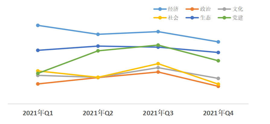 從近幾個季度的評估結(jié)果來看,除經(jīng)濟、生態(tài)領(lǐng)域,其他領(lǐng)域熱度值均在第三季度達到2021年度熱度指數(shù)峰值,但隨后呈下降趨勢。經(jīng)濟領(lǐng)域熱度值領(lǐng)先其他領(lǐng)域,政治領(lǐng)域改革熱度值偏低;社會、政治、黨建領(lǐng)域降幅較大。