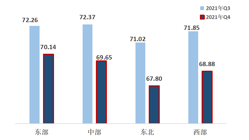 2、從區(qū)域來看,東北地區(qū)熱度指數(shù)下降明顯。東部、中部、西部、東北,指數(shù)分別為70.14、69.65、68.88、67.80。區(qū)域熱度指數(shù)呈地域特征,東部地區(qū)第一,中部地區(qū)第二,西部地區(qū)第三,東北地區(qū)最后。四大區(qū)域均比上一季度明顯下降,其中,東北、西部地區(qū)指數(shù)降幅較大。