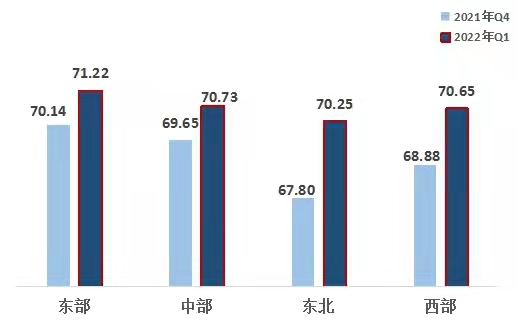 2、從區(qū)域來看,東北地區(qū)熱度指數(shù)提升明顯。東部、中部、西部、東北指數(shù)分別為71.22、70.73、70.65、70.25。區(qū)域熱度指數(shù)呈地域特征,東部地區(qū)第一,中部地區(qū)第二,西部地區(qū)第三,東北地區(qū)最后。四大區(qū)域均比上一季度明顯上升,其中,東北、西部地區(qū)指數(shù)升幅較大。