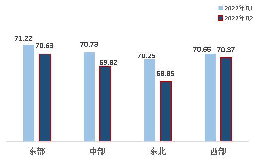2、從區(qū)域來看,西部地區(qū)熱度指數(shù)超越中部地區(qū)。東部、西部、中部、東北指數(shù)分別為70.63、70.37、69.82、68.85。區(qū)域熱度指數(shù)呈地域特征,東部地區(qū)第一,西部地區(qū)超越中部地區(qū)名列第二,東北地區(qū)最后。四大區(qū)域均比上一季度有所下滑,其中,東北、中部地區(qū)指數(shù)降幅較大。