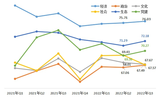 1、從領(lǐng)域來(lái)看,社會(huì)領(lǐng)域降幅略高于其他領(lǐng)域。第三季度,經(jīng)濟(jì)領(lǐng)域76.03,政治領(lǐng)域67.49 ,文化領(lǐng)域67.67,社會(huì)領(lǐng)域67.57,生態(tài)領(lǐng)域72.18,黨建領(lǐng)域70.27。與上一季度相比,經(jīng)濟(jì)、政治、生態(tài)、黨建領(lǐng)域上升,文化、社會(huì)領(lǐng)域下降。