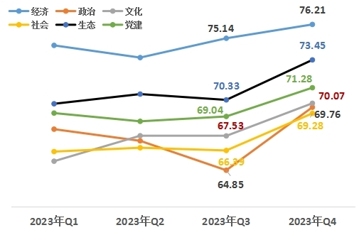 從改革熱度指數(shù)的六大領(lǐng)域來看,經(jīng)濟(jì)領(lǐng)域76.21,政治領(lǐng)域69.76,文化領(lǐng)域70.07,社會領(lǐng)域69.28,生態(tài)領(lǐng)域73.45,黨建領(lǐng)域71.28。與上一季度相比,六大領(lǐng)域均有上升,政治領(lǐng)域升幅最高,經(jīng)濟(jì)領(lǐng)域升幅最低。