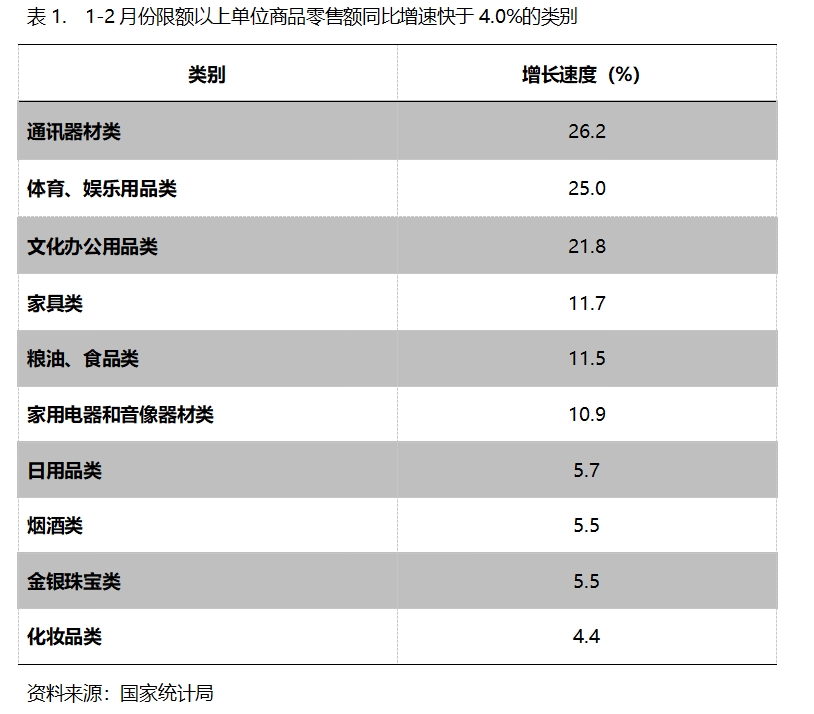 1-2月份,限額以上單位商品零售額增速快于社會(huì)消費(fèi)品零售總額4.0%增速的共有10類,即通訊器材類增長(zhǎng)26.2%,體育、娛樂(lè)用品類增長(zhǎng)25.0%,文化辦公用品類增長(zhǎng)21.8%,家具類增長(zhǎng)11.7%,糧油、食品類增長(zhǎng)11.5%,家用電器和音像器材類增長(zhǎng)10.9%,日用品類增長(zhǎng)5.7%,煙酒類增長(zhǎng)5.5%,金銀珠寶類增長(zhǎng)5.5%,化妝品類同比增長(zhǎng)4.4%。