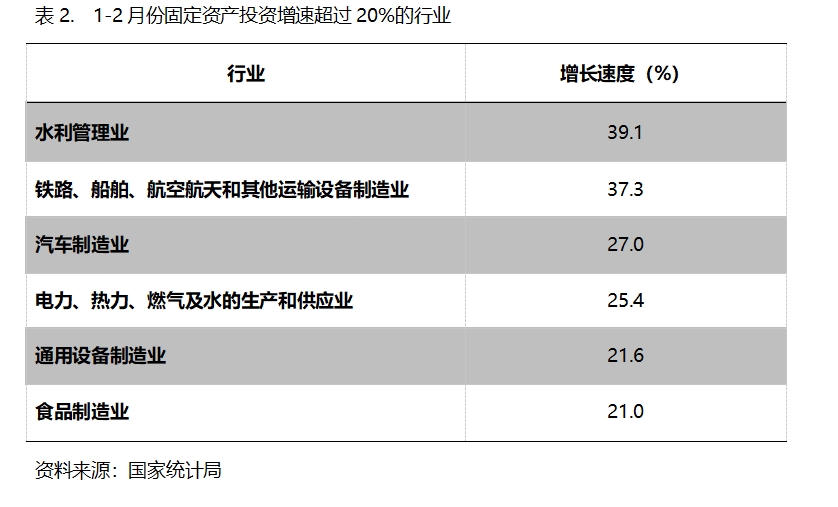 1-2月份,固定資產(chǎn)投資增速超過(guò)20%的主要行業(yè)共6個(gè),即水利管理業(yè)增長(zhǎng)39.1%,鐵路、船舶、航空航天和其他運(yùn)輸設(shè)備制造業(yè)增長(zhǎng)37.3%,汽車制造業(yè)增長(zhǎng)27.0%,電力、熱力、燃?xì)饧八纳a(chǎn)和供應(yīng)業(yè)增長(zhǎng)25.4%,通用設(shè)備制造業(yè)增長(zhǎng)21.6%,食品制造業(yè)增長(zhǎng)21.0%。