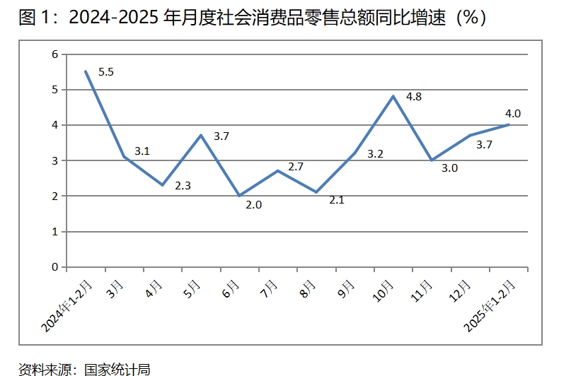 (一)零售增速繼續(xù)回升。1-2月份,社會(huì)消費(fèi)品零售總額同比增長(zhǎng)4.0%,比上年12月份增長(zhǎng)3.7%回升了0.3個(gè)百分點(diǎn),上年12月份比上年11月份增長(zhǎng)3.0%回升了0.7個(gè)百分點(diǎn)。數(shù)據(jù)顯示,社會(huì)消費(fèi)品零售總額保持了持續(xù)回升的勢(shì)頭,這是上年以來(lái)采取的以舊換新等系列促進(jìn)消費(fèi)政策措施的結(jié)果,特別需要指出的是,這一增速是在上年同期基數(shù)較高基礎(chǔ)上的回升,更加說(shuō)明消費(fèi)增長(zhǎng)的動(dòng)力在增強(qiáng)。