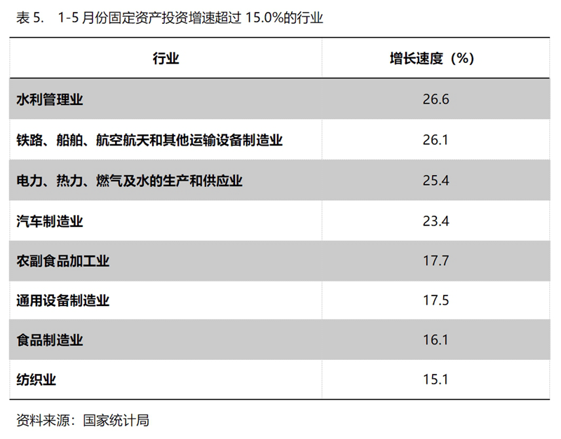 1-5月份,固定資產(chǎn)投資增速超過15%的主要行業(yè)共8個(gè),即水利管理業(yè)增長26.6%,鐵路、船舶、航空航天和其他運(yùn)輸設(shè)備制造業(yè)增長26.1%,電力、熱力、燃?xì)饧八纳a(chǎn)和供應(yīng)業(yè)增長25.4%,汽車制造業(yè)增長23.4%,農(nóng)副食品加工業(yè)增長17.7%,通用設(shè)備制造業(yè)增長17.5%,食品制造業(yè)增長16.1%,紡織業(yè)增長15.1%。