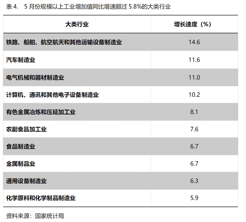 5月份,增長速度超過規(guī)模以上工業(yè)增長5.8%的主要大類行業(yè)共有10個(gè),即鐵路、船舶、航空航天和其他運(yùn)輸設(shè)備制造業(yè)增長14.6%,汽車制造業(yè)增長11.6%,電氣機(jī)械和器材制造業(yè)增長11.0%,計(jì)算機(jī)、通訊和其他電子設(shè)備制造業(yè)增長10.2%,有色金屬冶煉和壓延加工業(yè)增長8.1%,農(nóng)副食品加工業(yè)增長7.6%,食品制造業(yè)增長6.7%,金屬制品業(yè)增長6.7%,通用設(shè)備制造業(yè)增長6.3%,化學(xué)原料和化學(xué)制品制造業(yè)增長5.9%。