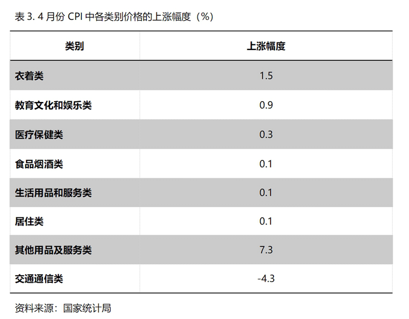 5月份,在CPI 8個(gè)類別中有7個(gè)類別保持上漲,1個(gè)類別下降。上漲的7個(gè)類別包括衣著類價(jià)格同比上漲1.5%,教育文化和娛樂類上漲0.9%,醫(yī)療保健類上漲0.3%,食品煙酒類上漲0.1%,生活用品及服務(wù)類上漲0.1%,居住類上漲0.1%,其他用品和服務(wù)類上漲7.3%;下降的雖然就交通通信類1個(gè)類別,但降幅較大,5月份同比下降4.3%。