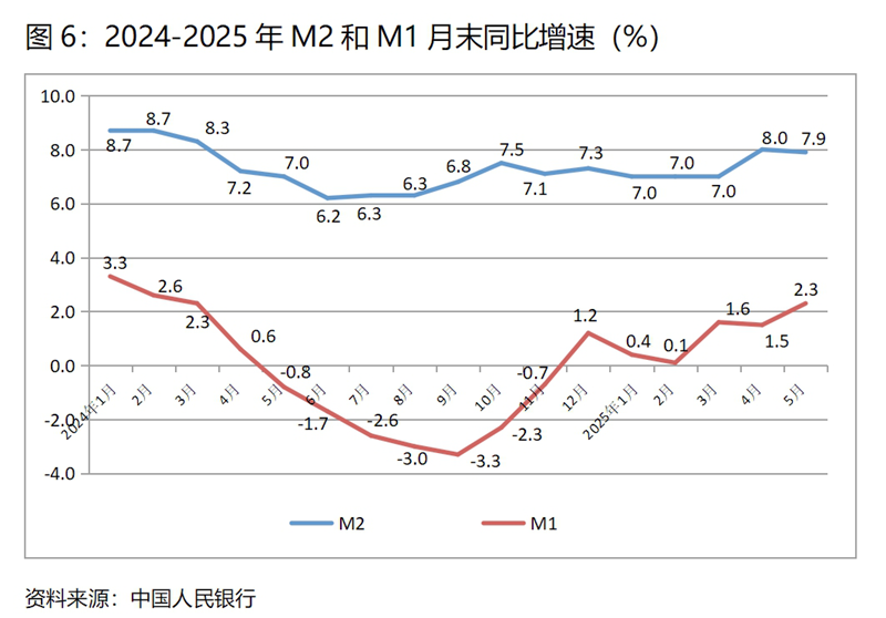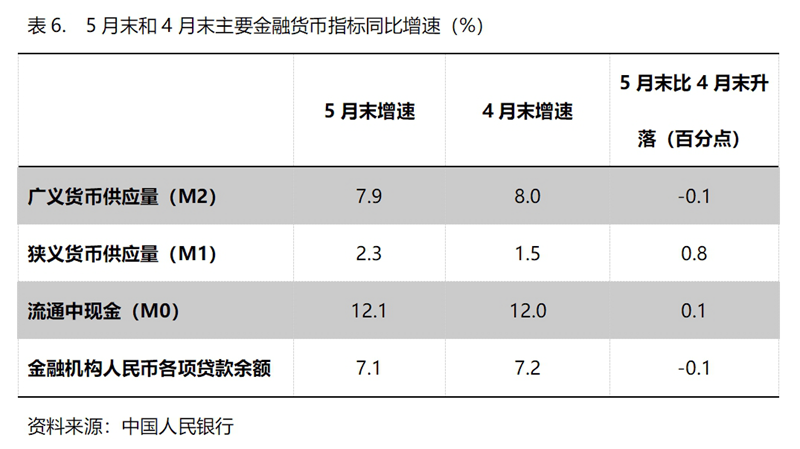 (六)M2增速由升轉(zhuǎn)落。5月末,廣義貨幣供應(yīng)量(M2)同比增長7.9%,比4月末增長8.0%回落0.1個(gè)百分點(diǎn),基本保持了上月末的增速;狹義貨幣供應(yīng)量(M1)增速比上月有所回升,5月末同比增長2.3%,比4月末增長1.5%回升0.8個(gè)百分點(diǎn),而4月末增幅比3月末增幅回落0.1個(gè)百分點(diǎn);流通中貨幣(M0)增速持續(xù)回升,5月末同比增長12.1%,比4月末增長12.0%回升0.1個(gè)百分點(diǎn),而4月末增速比3月末增速回升0.5個(gè)百分點(diǎn)。5月末M2增速與上月增速基本持平,M1和M0增速回升,表明貨幣政策仍在向適度寬松方向的要求運(yùn)行,但需要關(guān)注的還是M1增速仍還比較緩慢。