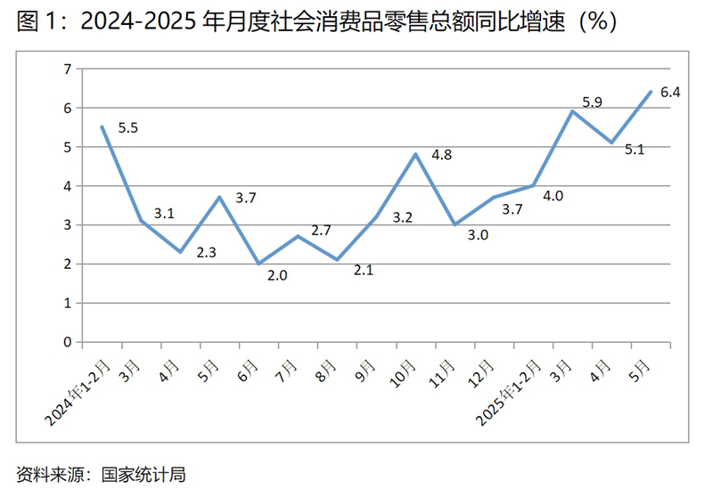 (一)零售增速由落轉(zhuǎn)升。5月份,社會(huì)消費(fèi)品零售總額同比增長6.4%,比4月份增長5.1%回升了1.3個(gè)百分點(diǎn),4月份比3月份增長5.8%回落了0.7個(gè)百分點(diǎn),社會(huì)消費(fèi)品零售總額增速由上月回落轉(zhuǎn)為回升,為上年以來月度同比增速最快的月份。這是近一個(gè)時(shí)期特別是今年以來持續(xù)采取以舊換新等一系列擴(kuò)大消費(fèi)政策措施的結(jié)果,同時(shí)也說明只要采取積極有效的政策措施,是能夠取得一些領(lǐng)域持續(xù)回升的效果。