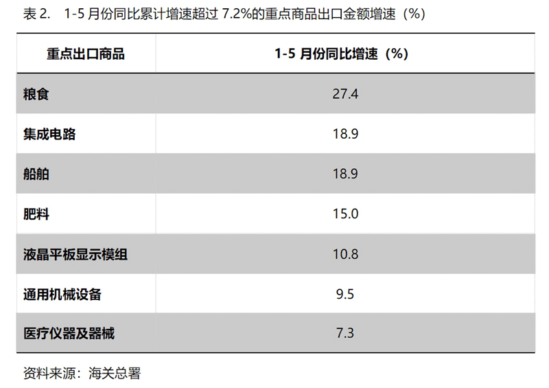 1-5月份,出口金額同比增速超過7.2%的重點(diǎn)商品共有7類,即糧食增長27.4%,集成電路增長18.9%,船舶增長18.9%,肥料出口增長15.0%,液晶平板顯示模組增長10.8%,通用機(jī)器設(shè)備增長9.5%,醫(yī)療儀器及器械增長7.3%。
