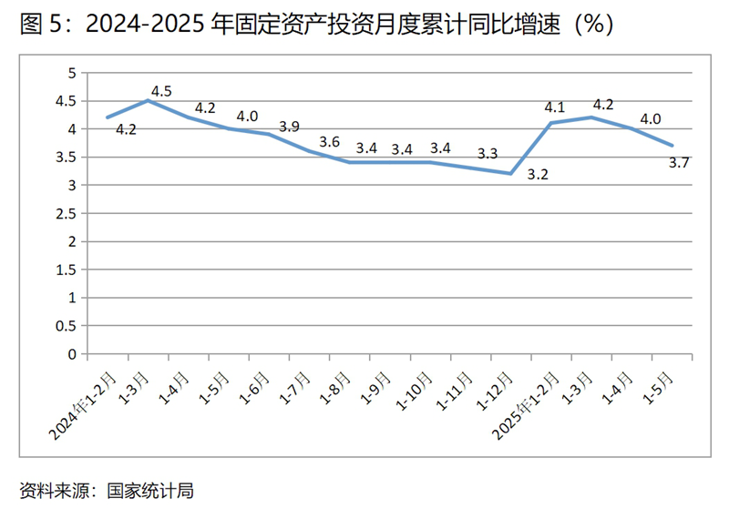 (五)投資增速持續(xù)回落。1-5月份,固定資產(chǎn)投資同比增長3.7%,比1-4月份增長4.0%回落了0.3個(gè)百分點(diǎn),1-4月份增速比1-3月份增長4.2%回落了0.2個(gè)百分點(diǎn),增速呈現(xiàn)出持續(xù)的回落。1-5月份國有控股投資同比增速比1-4月份回落0.3個(gè)百分點(diǎn);民間投資回落了0.2個(gè)百分點(diǎn)。三次產(chǎn)業(yè)投資中,第一產(chǎn)業(yè)投資增速回落4.8個(gè)百分點(diǎn),第二產(chǎn)業(yè)投資增速回落0.3個(gè)百分點(diǎn),第三產(chǎn)業(yè)投資降幅擴(kuò)大0.2 百分點(diǎn)。民間投資和第三產(chǎn)業(yè)投資增長仍比較緩慢。