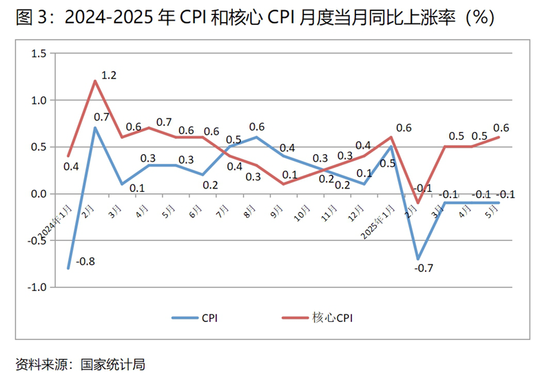 (三) CPI降幅持續(xù)持平。5月份,CPI同比下降0.1%,與4月份下降0.1%持平, CPI已連續(xù)4個(gè)月下降,連續(xù)3個(gè)月保持下降0.1%;5月份,核心CPI同比上漲0.6%,比4月份上漲0.5%上升了0.1個(gè)百分點(diǎn)。CPI保持持續(xù)下降的趨勢(shì),有季節(jié)性食品和國際石油價(jià)格下降因素的影響,但核心CPI漲幅仍保持在低位運(yùn)行,說明需求特別是消費(fèi)需求仍還較為偏弱,擴(kuò)大需求特別是消費(fèi)需求還需要進(jìn)一步加大力度。