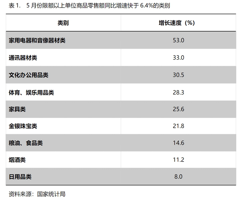 5月份,限額以上單位商品零售額增速快于社會(huì)消費(fèi)品零售總額6.4%增速的共有9類,即家用電器和音像器材類增長53.0%,通訊器材類增長33.0%,文化辦公用品類增長30.5%,體育、娛樂用品類增長28.3%,家具類增長25.6%,金銀珠寶類增長21.8%,糧油、食品類增長14.6%,煙酒類增長11.2%,日用品類增長8.0%。