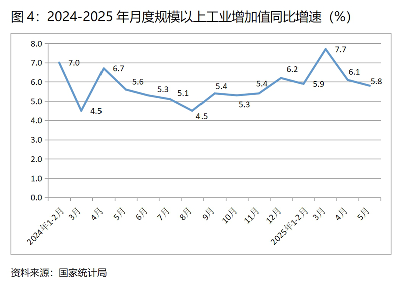 (四)工業(yè)增速持續(xù)回落。5月份,規(guī)模以上工業(yè)增加值同比增長5.8%,比上月增長6.1%回落了0.3個(gè)百分點(diǎn),4月份比3月份回落了1.6個(gè)百分點(diǎn),呈現(xiàn)出兩個(gè)月的連續(xù)回落。從工業(yè)三大門類看,主要是制造業(yè)增速回落。5月份采礦業(yè)同比增長5.7%,與上月持平;制造業(yè)增長6.2%,比上月回落0.4個(gè)百分點(diǎn);電力、熱力、燃?xì)饧八a(chǎn)和供應(yīng)業(yè)增長2.2%,比上月回升0.1個(gè)百分點(diǎn)。5月份工業(yè)增速回落幅度雖然比上月收窄不少,但還是要密切關(guān)注回落背后反映出的工業(yè)增長動(dòng)力未來可能變動(dòng)的趨勢(shì)。