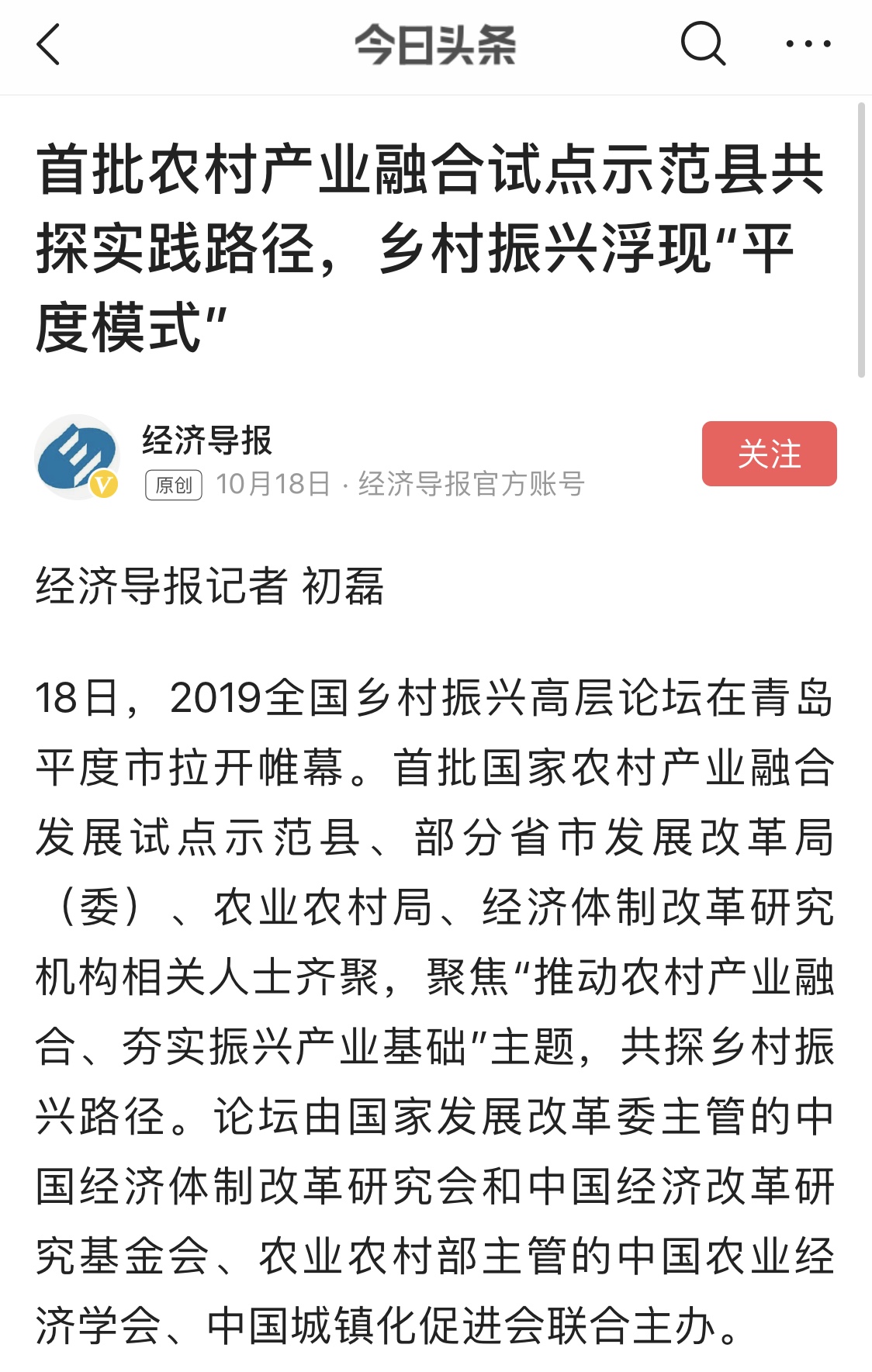 10月18日,中國經(jīng)濟(jì)體制改革研究會、中國農(nóng)業(yè)經(jīng)濟(jì)學(xué)會、中國經(jīng)濟(jì)改革研究基金會、中國城鎮(zhèn)化促進(jìn)會聯(lián)合主辦的2019全國鄉(xiāng)村振興高層論壇在平度市開幕,開啟了以“推動農(nóng)村產(chǎn)業(yè)融合 夯實(shí)振興產(chǎn)業(yè)基礎(chǔ)”為主題的大討論。論壇上,中國經(jīng)濟(jì)體制改革研究會宣布把平度市列為博士后科研工作站調(diào)研基地,并授予平度“中國經(jīng)濟(jì)體制改革研究會博士后科研工作站調(diào)研基地”標(biāo)牌。
