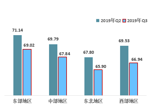 2.從四大區(qū)域來(lái)看,東部和中部地區(qū)繼續(xù)保持第一、第二,東北地區(qū)從上季度開始落后西部地區(qū)的情況沒(méi)有發(fā)生改變,而且差距呈擴(kuò)大趨勢(shì);